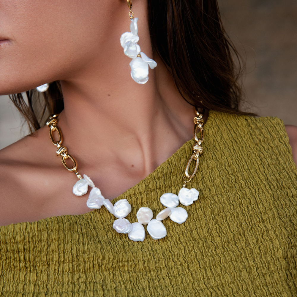 Un bijou au charme organique, composé de pierres naturelles aux formes brutes qui évoquent la force et la pureté de la nature. En son centre, une perle d’eau douce plate vient adoucir l’ensemble, comme une parenthèse de délicatesse. Le collier Layla se porte comme un talisman unique, entre authenticité et raffinement.